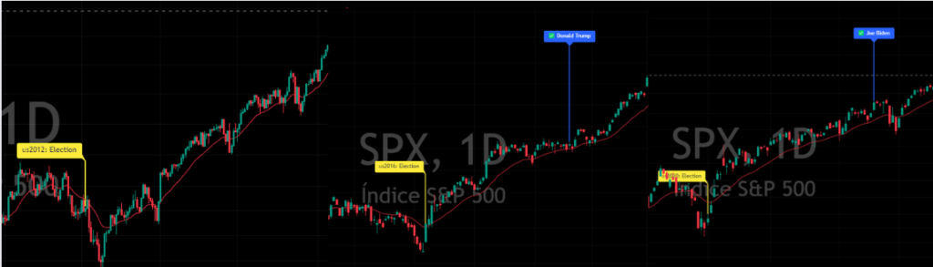 Não faz sentido olhar muito para notícias, quando o que mais importa são os gráficos. Pessoalmente me lembro como o mercado tinha medo do Joe Biden eleito, na última eleição contra o Trump, e o que veio depois foi uma mega bear trap, e um belo rally que durou meses. Abaixo vamos analisar o que os mercados fizerem na véspera e pós eleição.